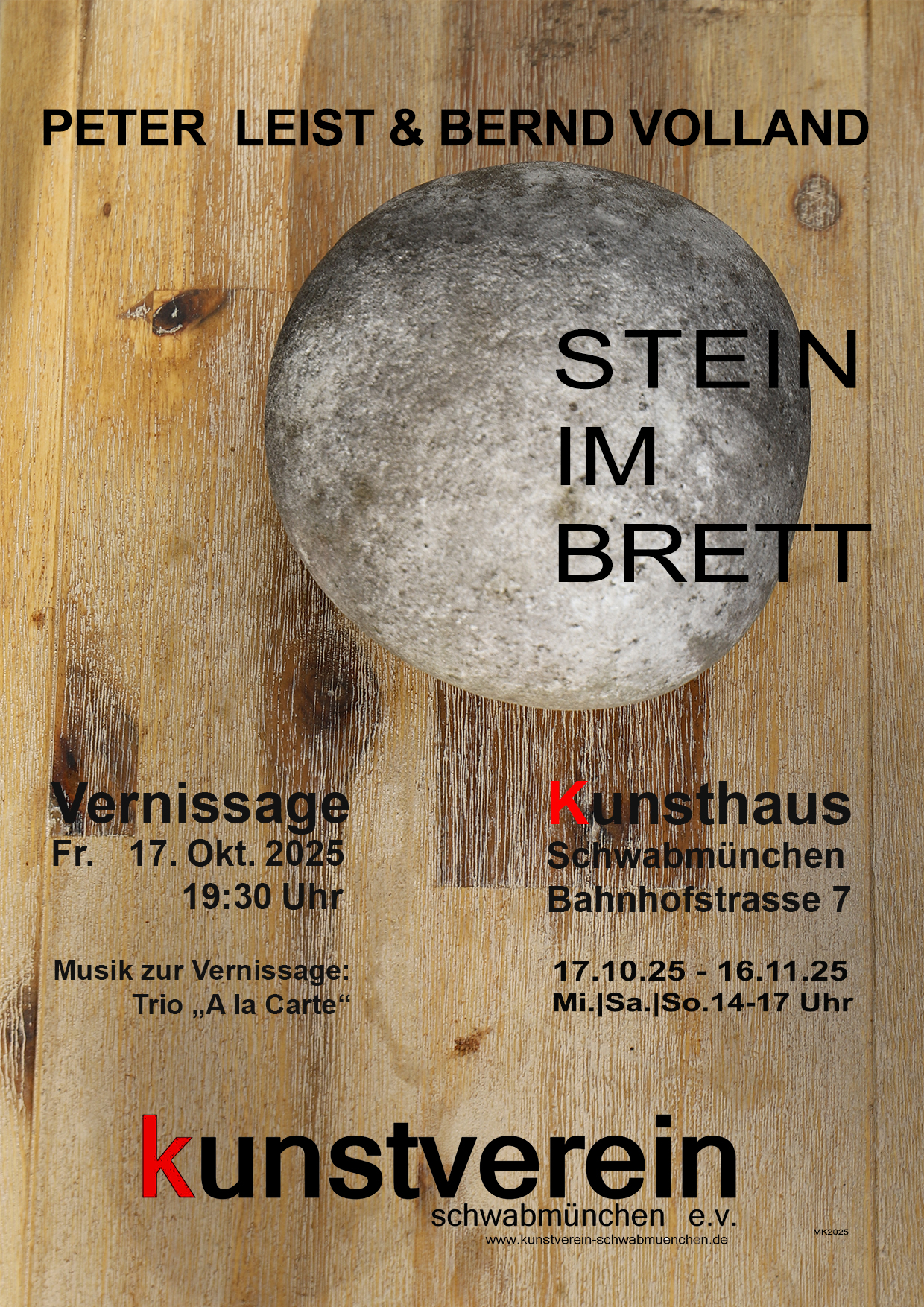 Kunsthaus Schwabmünchen Bahnhofstraße 7, Schwabmünchen, Bayern, DeutschlandAusstellung STEIN IM BRETT Peter Leist & Bernd Volland Ausstellungsdauer: 18.10. bis 16.11.2025 Öffnungszeiten: MI SA SO | 14:00 bis 17:00 Uhr Peter Leist arbeitet mit Stein, Holz und Metall – er erforscht seine Materialien und ist immer wieder beeindruckt von der Schönheit der Farben und Formen, die auch der Stein schon in sich trägt. […]